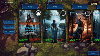 Everything from the games menus, story and card collection features was manually made and the game is a work in progress with at least a few hours of play and features auto save game and load features, buying cards and earning rewards. AI was used only for the Card Graphics.